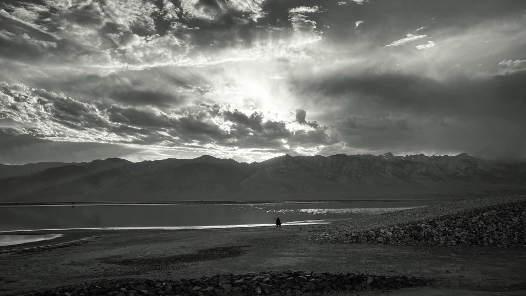 With our deep alteration of the Owens Valley in the pursuit of water the starkest visual experience is Owens Lake. After the water was diverted it has been drying out to the point of being a salt flat at times, but when there are puddles of water left on the surface, the pools can have different colors depending on the saline levels and types. We tend to be drawn to the more unusual colors like orange, pink, and bloody red. These were taken from opposite sides of a raised road where the water gates had been closed to dry out one side first.