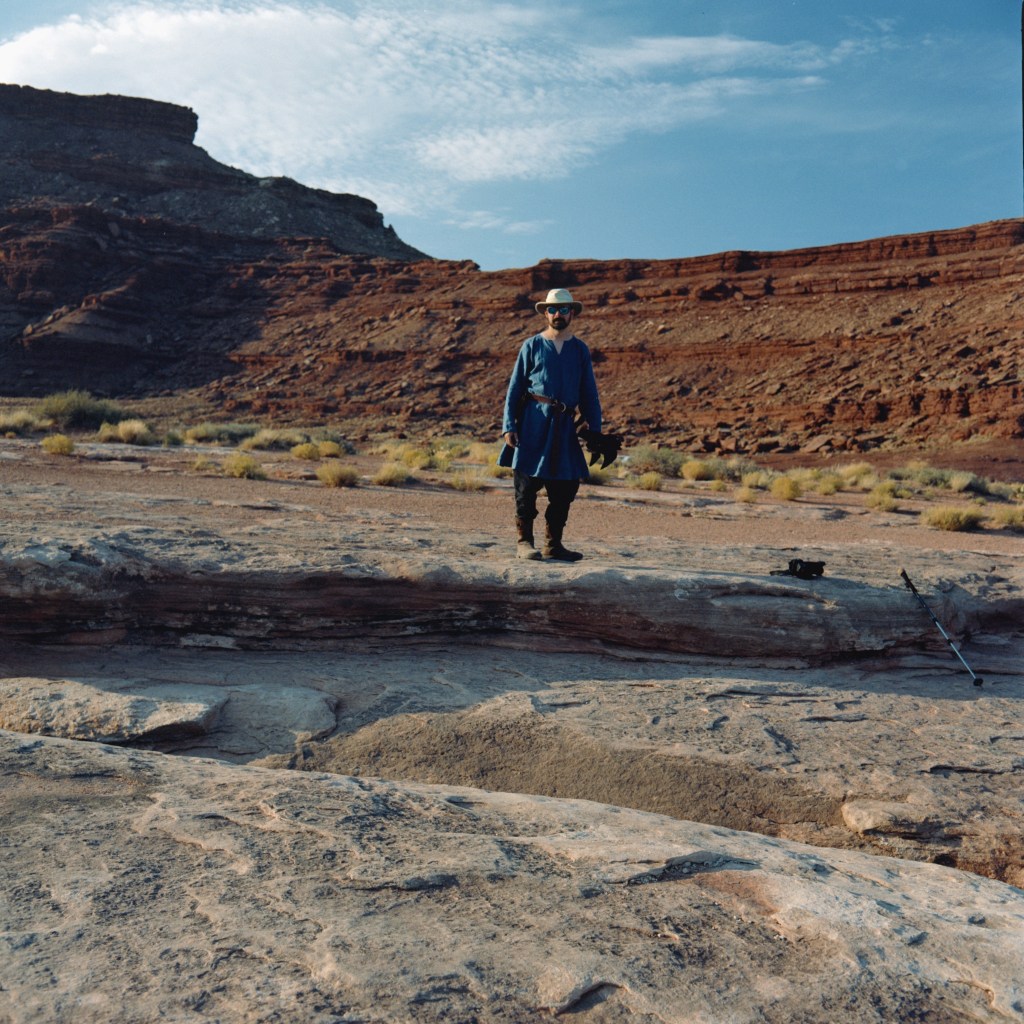 Here are a few of the results on Portra 160 of Joaquin in various states of partial cos-play, shot outside of the digital work he needed for his books. After processing the film, I scan it using a down-shooter setup at home. Once I got used the the focal lengths of the lenses and composing with the view screen with progressive bifocals (a sometimes infuriating process) it makes me think about compositions more before I look through the view screen.